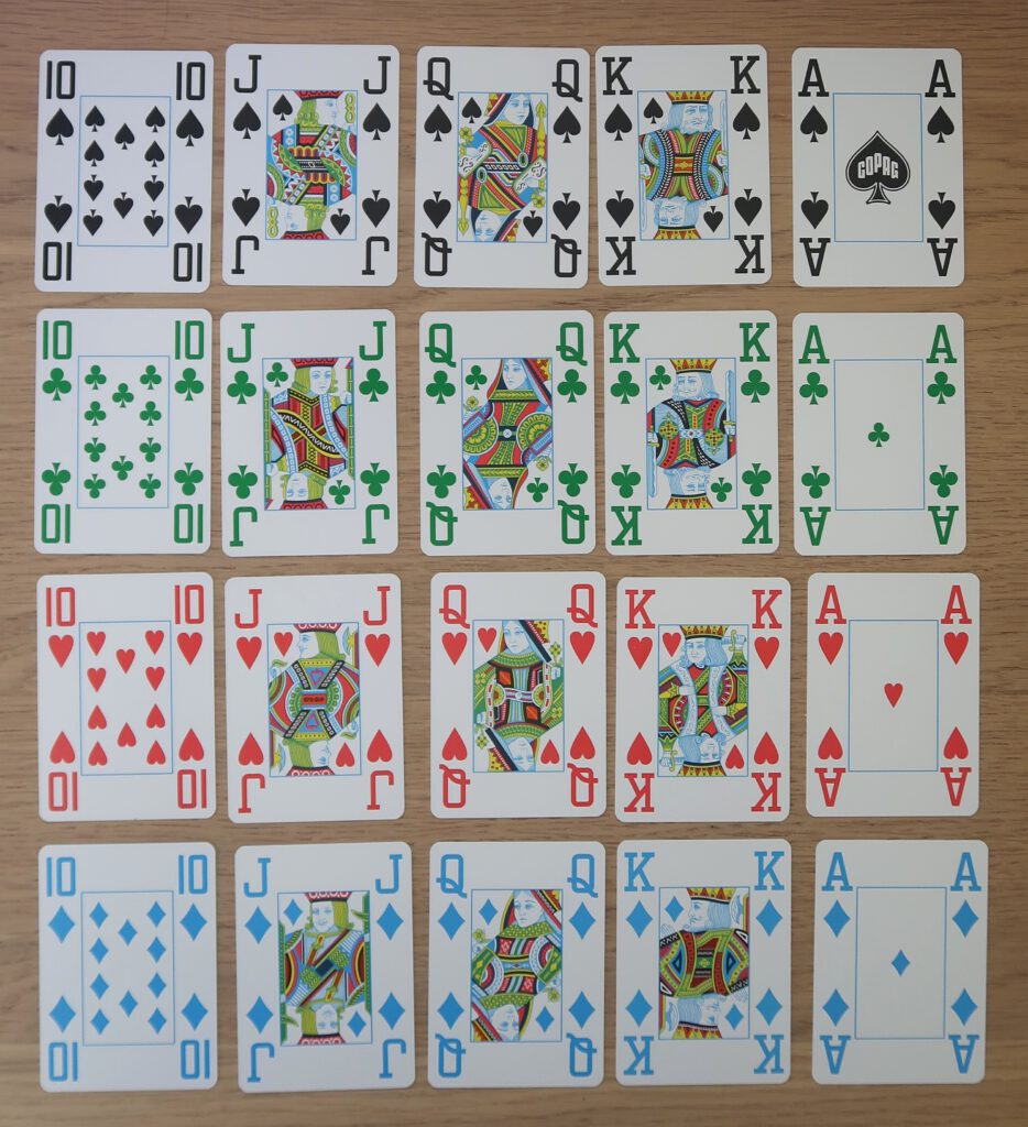 Es handelt sich dabei um ein Blatt auf Basis des französischen Farbsystems (Kreuz, Pik, Herz, Karo) mit anglo-amerikanischen Eckzeichen J (Jack), Q (Queen) und K (King).